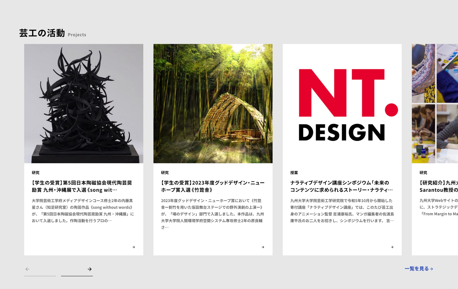 その実現のため、導線の整理とコンテンツの拡充に重点を置き、芸工らしさを持ったクリエーティブの実現と情報の発信、授業を含む研究活動やイベントなどの情報を魅力的な形で発信できるようなデザインとしました。